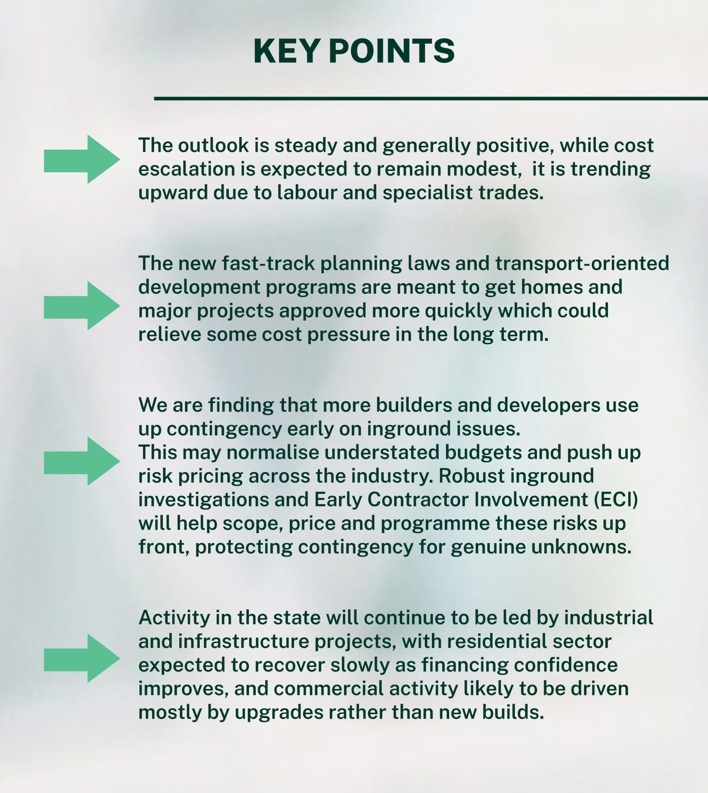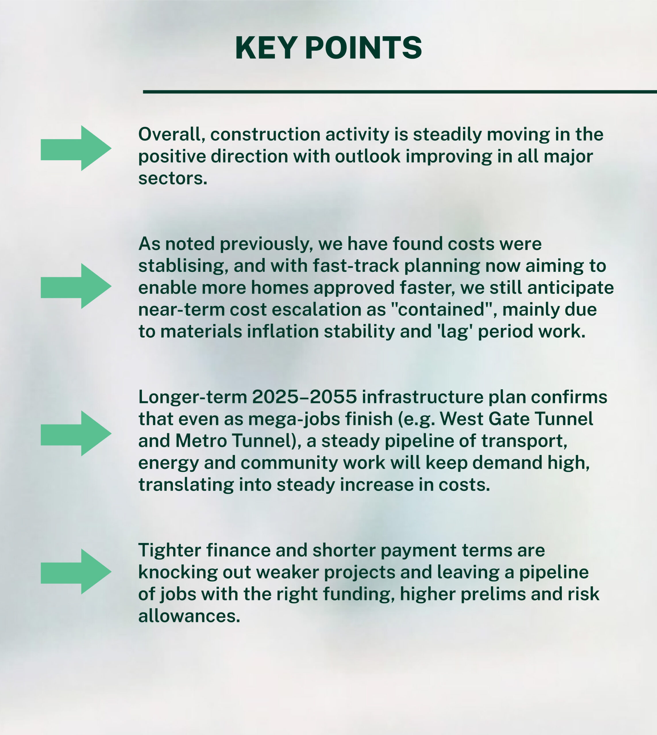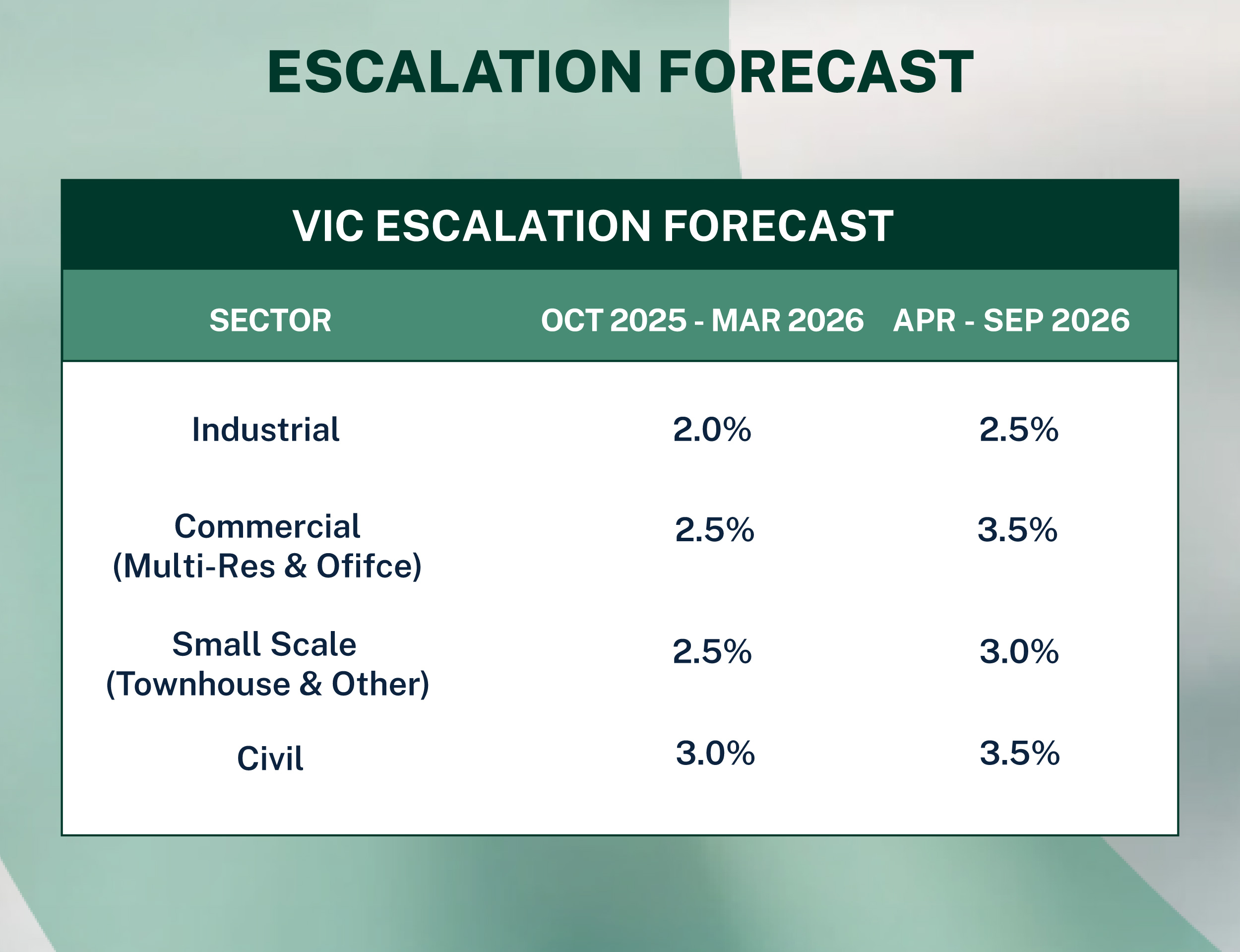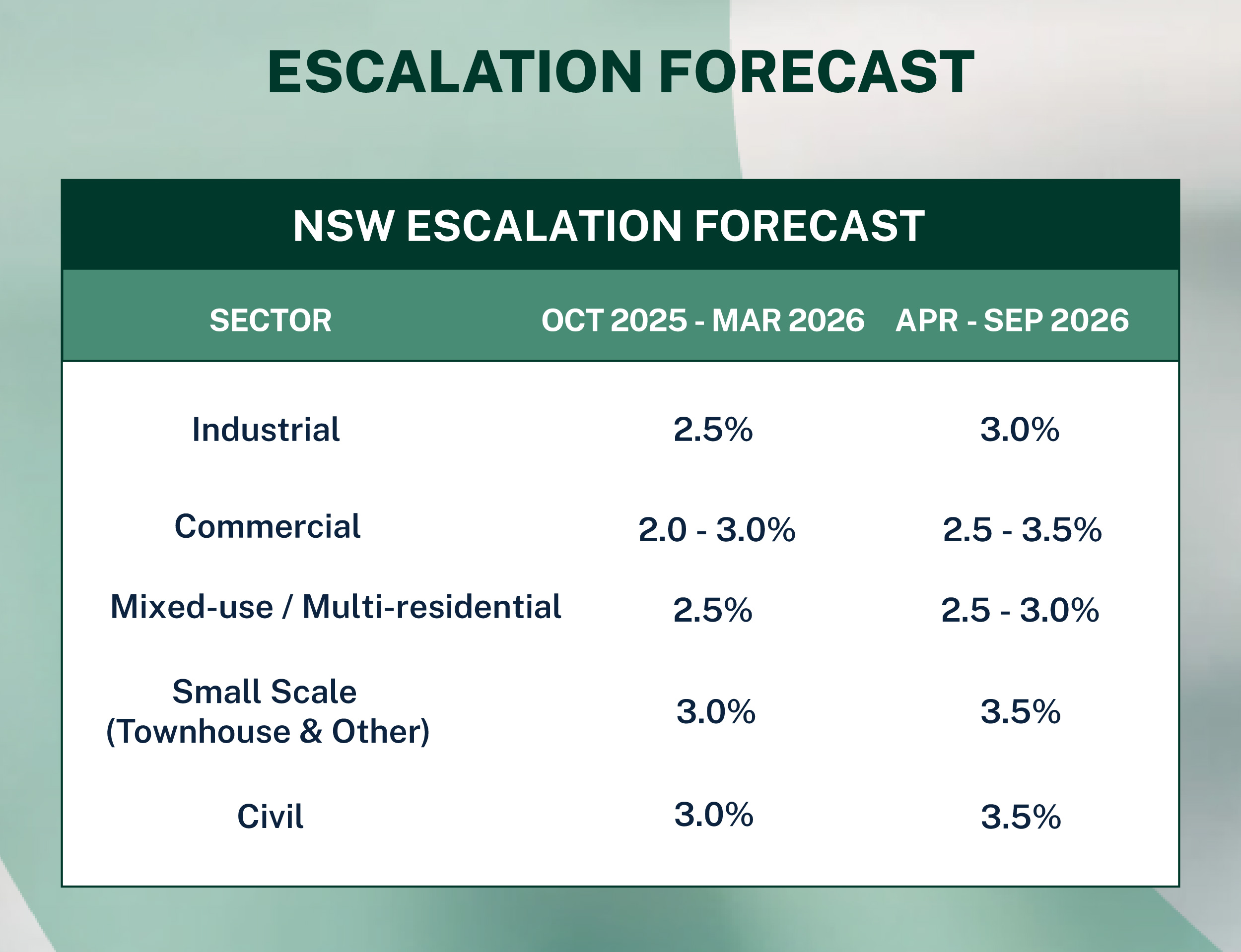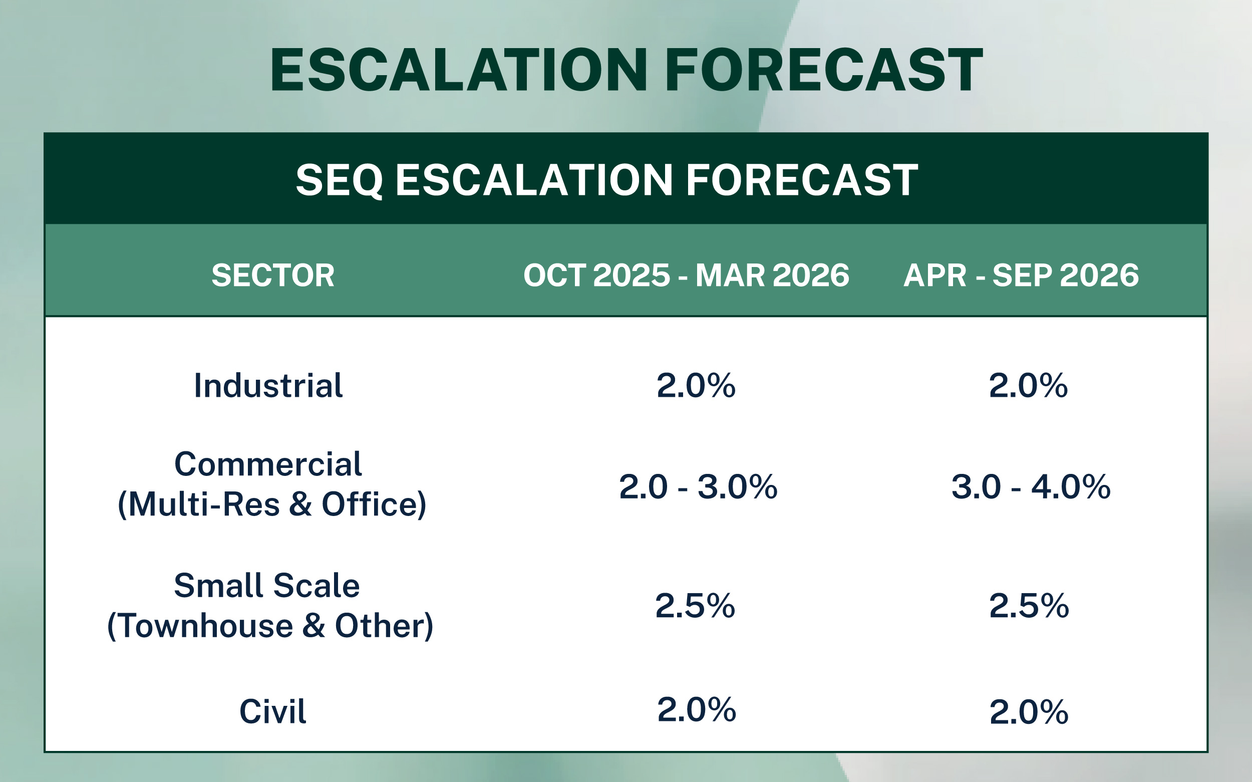 Structural Trades: Formwork, reinforcement, façade systems and roofing remain at elevated rates due to capacity constraints.